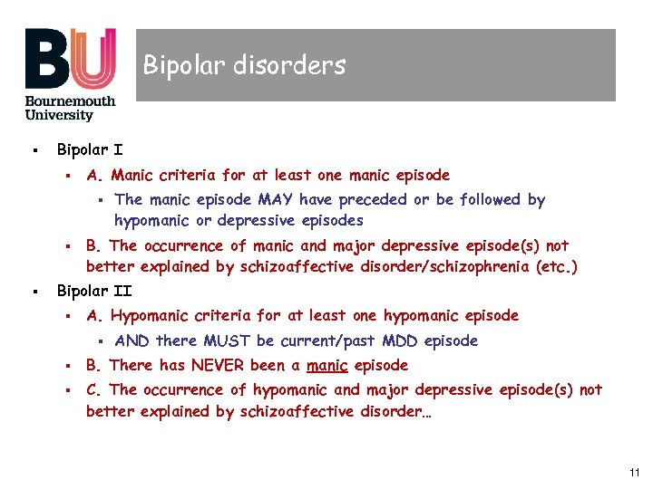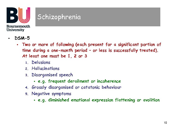 Schizophrenia § DSM-5 § Two or more of following (each present for a significant portion of time during a one-month period – or less is successfully treated). At least one must be 1, 2 or 3 1. Delusions 2. Hallucinations 3. Disorganised speech § e. g. frequent derailment or incoherence 4. Grossly disorganised or catatonic behaviour 5. Negative symptoms § e. g. diminished emotional expression flattening or avolition 10