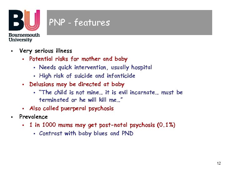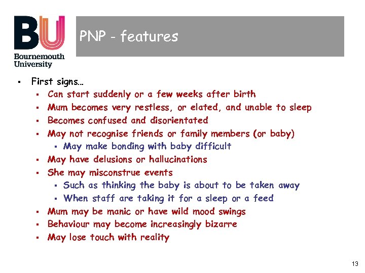 PNP - features § § Very serious illness § Potential risks for mother and baby § Needs quick intervention, usually hospital § High risk of suicide and infanticide § Delusions may be directed at baby § “The child is not mine… it is evil incarnate… must be terminated or he will kill me…” § Also called puerperal psychosis Prevalence § 1 in 1000 mums may get post-natal psychosis (0. 1%) § Contrast with baby blues and PND 12