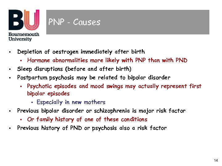 PNP - features § First signs… § Can start suddenly or a few weeks after birth § Mum becomes very restless, or elated, and unable to sleep § Becomes confused and disorientated § May not recognise friends or family members (or baby) § May make bonding with baby difficult § May have delusions or hallucinations § She may misconstrue events § Such as thinking the baby is about to be taken away § When staff are taking it for a sleep or a feed § Mum may be manic or have wild mood swings § Behaviour may become increasingly bizarre § May lose touch with reality 13