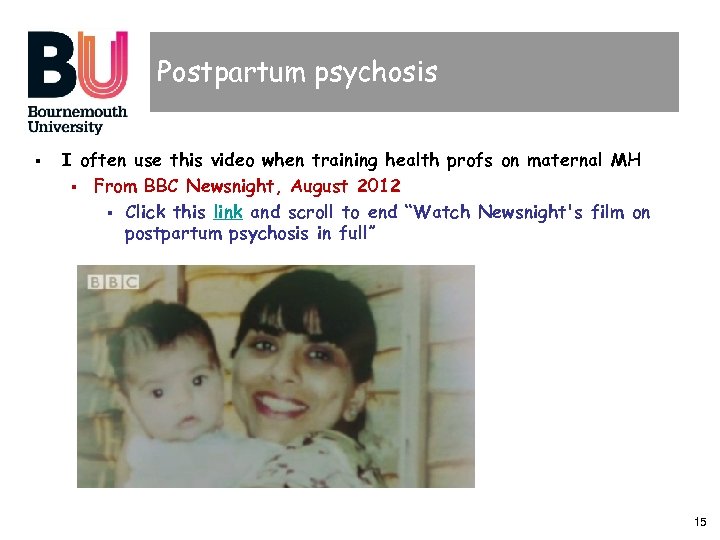 Postpartum psychosis § I often use this video when training health profs on maternal MH § From BBC Newsnight, August 2012 § Click this link and scroll to end “Watch Newsnight's film on postpartum psychosis in full” 15