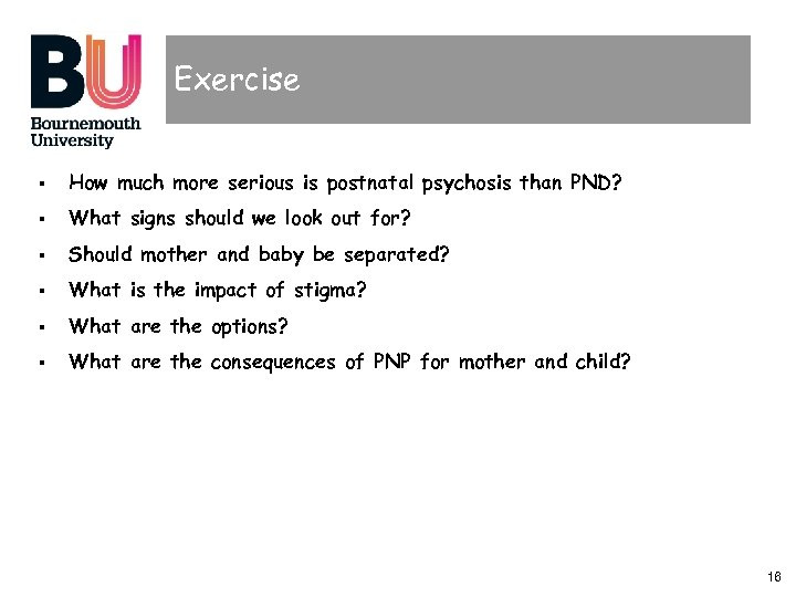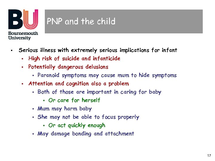 Exercise § How much more serious is postnatal psychosis than PND? § What signs should we look out for? § Should mother and baby be separated? § What is the impact of stigma? § What are the options? § What are the consequences of PNP for mother and child? 16