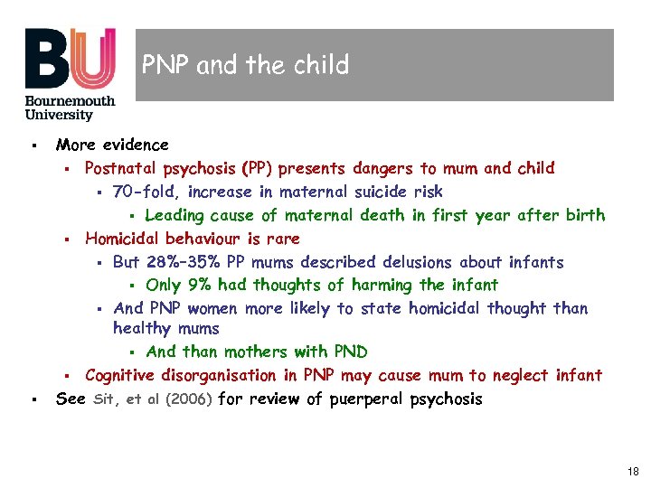 PNP and the child § Serious illness with extremely serious implications for infant § High risk of suicide and infanticide § Potentially dangerous delusions § § Paranoid symptoms may cause mum to hide symptoms Attention and cognition also a problem § Both of those are important in caring for baby § Or care for herself § Mum may harm baby § She may not be able to focus properly § § Or act quickly enough May damage bonding and attachment 17