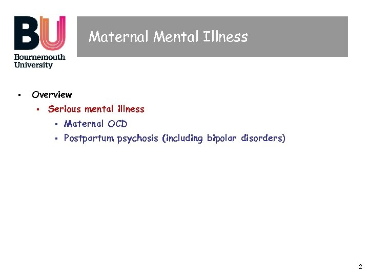 Maternal Mental Illness § Overview § Serious mental illness § Maternal OCD § Postpartum psychosis (including bipolar disorders) 2