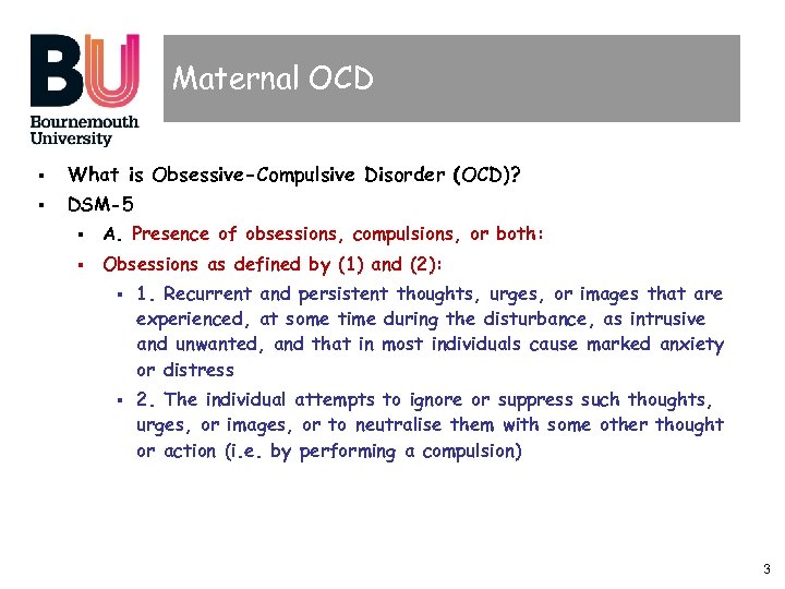 Maternal OCD § What is Obsessive-Compulsive Disorder (OCD)? § DSM-5 § A. Presence of obsessions, compulsions, or both: § Obsessions as defined by (1) and (2): § § 1. Recurrent and persistent thoughts, urges, or images that are experienced, at some time during the disturbance, as intrusive and unwanted, and that in most individuals cause marked anxiety or distress 2. The individual attempts to ignore or suppress such thoughts, urges, or images, or to neutralise them with some other thought or action (i. e. by performing a compulsion) 3