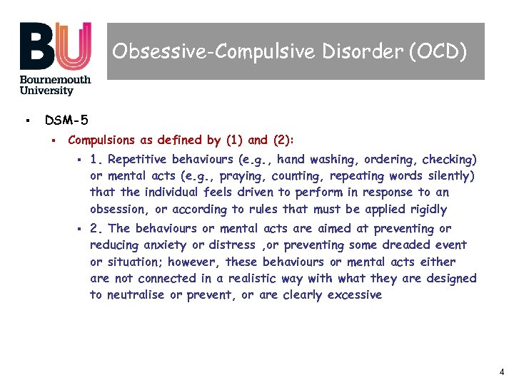 Obsessive-Compulsive Disorder (OCD) § DSM-5 § Compulsions as defined by (1) and (2): § § 1. Repetitive behaviours (e. g. , hand washing, ordering, checking) or mental acts (e. g. , praying, counting, repeating words silently) that the individual feels driven to perform in response to an obsession, or according to rules that must be applied rigidly 2. The behaviours or mental acts are aimed at preventing or reducing anxiety or distress , or preventing some dreaded event or situation; however, these behaviours or mental acts either are not connected in a realistic way with what they are designed to neutralise or prevent, or are clearly excessive 4