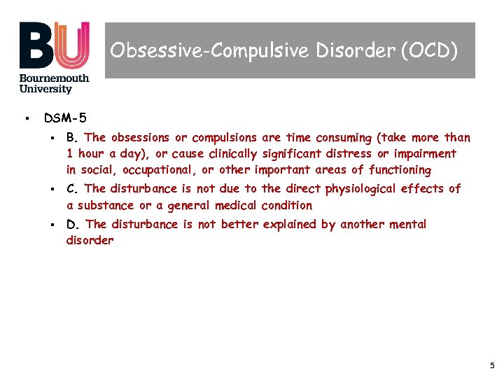 Obsessive-Compulsive Disorder (OCD) § DSM-5 § § § B. The obsessions or compulsions are time consuming (take more than 1 hour a day), or cause clinically significant distress or impairment in social, occupational, or other important areas of functioning C. The disturbance is not due to the direct physiological effects of a substance or a general medical condition D. The disturbance is not better explained by another mental disorder 5