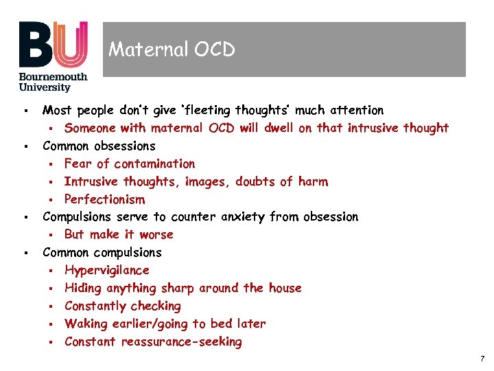 Maternal OCD § Prevalence – 2. 5 -9% in perinatal period § Compare to 1% OCD generally § § Some ‘mums’ get OCD for 1 st time § § Or can be related to anxiety/uncertainty Over-vigilance on safety/protection can trigger compulsions § § While, for others, symptoms worsen Increased prevalence may be due to ‘safety’ behaviours § § And yet, Maternal OCD often overlooked Cleaning, praying, rumination, avoidance… It’s not the ‘thought’ of safety that’s the problem § The worry of having thought (and reaction to that) IS § See Fairbrother & Abramowitz 2007 6