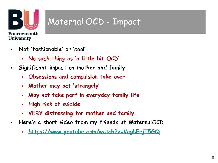Maternal OCD - Impact § Not ‘fashionable’ or ‘cool’ § § No such thing as ‘a little bit OCD’ Significant impact on mother and family § § Mother may act ‘strangely’ § May not take part in everyday family life § High risk of suicide § § Obsessions and compulsion take over VERY distressing for mother and family Here’s a short video from my friends at Maternal. OCD § https: //www. youtube. com/watch? v=Vcgh. Erj. T 5 GQ 8