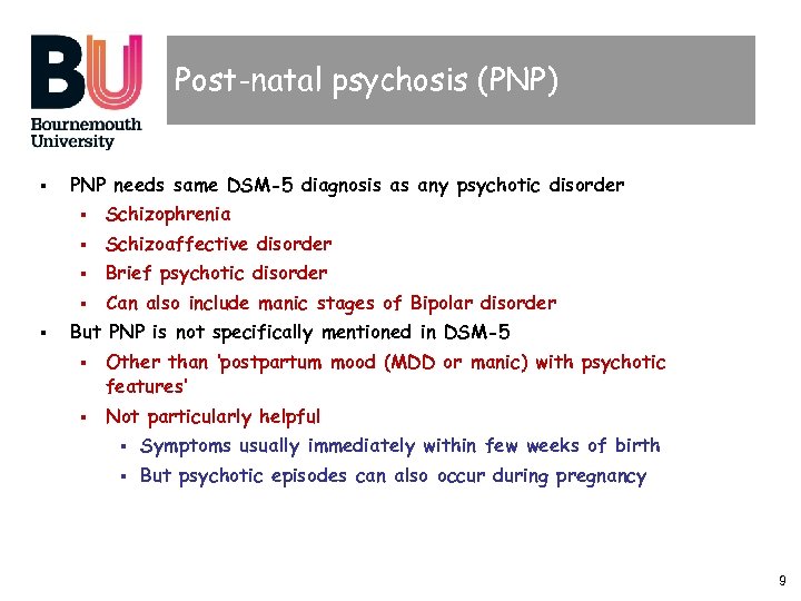 Post-natal psychosis (PNP) § PNP needs same DSM-5 diagnosis as any psychotic disorder § § Schizoaffective disorder § Brief psychotic disorder § § Schizophrenia Can also include manic stages of Bipolar disorder But PNP is not specifically mentioned in DSM-5 § § Other than ‘postpartum mood (MDD or manic) with psychotic features’ Not particularly helpful § Symptoms usually immediately within few weeks of birth § But psychotic episodes can also occur during pregnancy 9