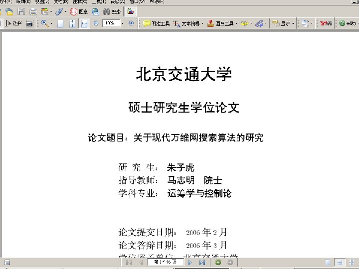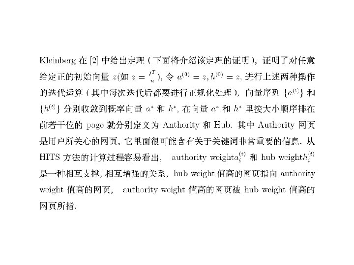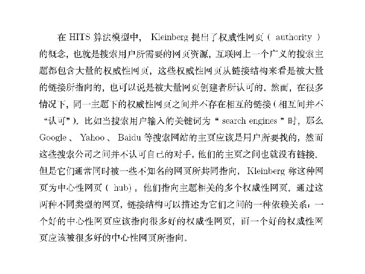 Nevanlinna Prize(2006) Jon Kleinberg • One of Kleinberg‘s most important research achievements focuses on the internetwork structure of the World Wide Web. • Prior to Kleinberg‘s work, search engines focused only on the content of web pages,not on the link structure. • Kleinberg introduced the idea of • “authorities” and “hubs”: • An authority is a web page that contains information on a particular topic, • and a hub is a page that contains links to many authorities. Zhuzihu thesis. pdf