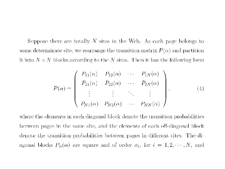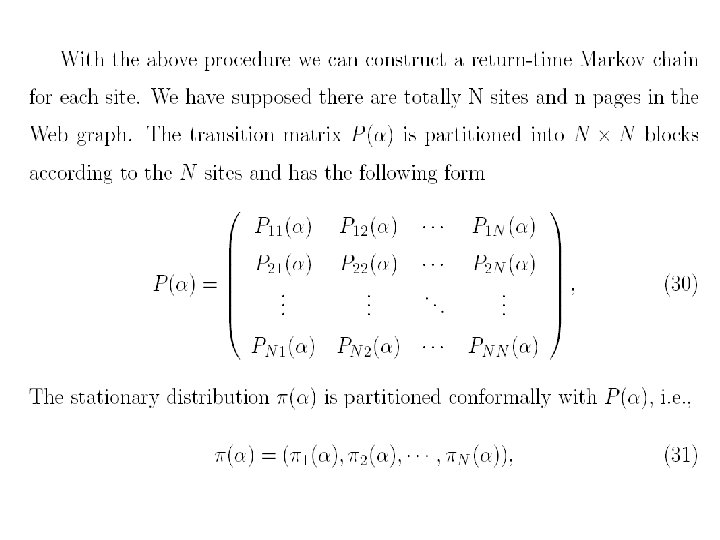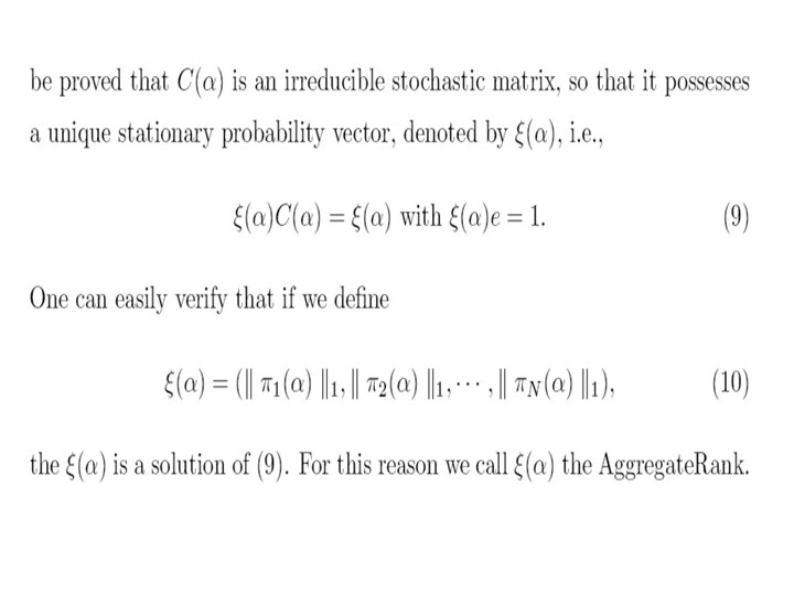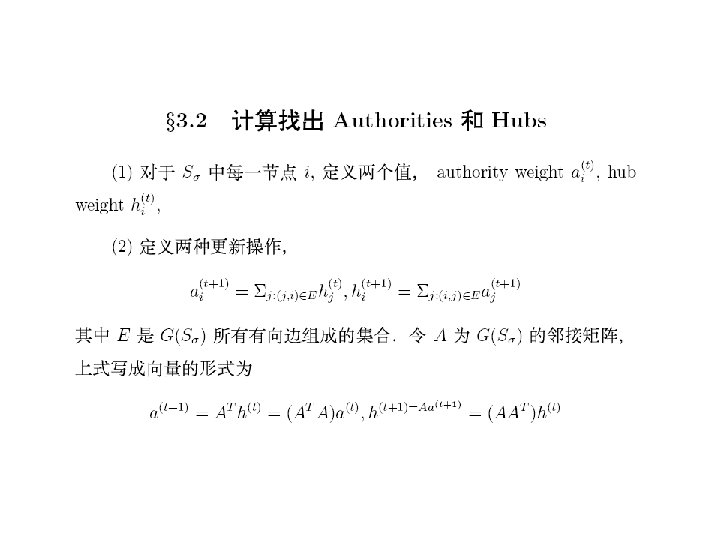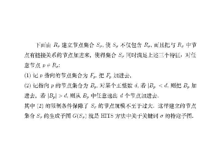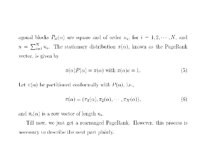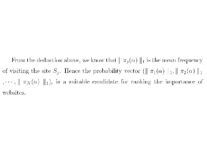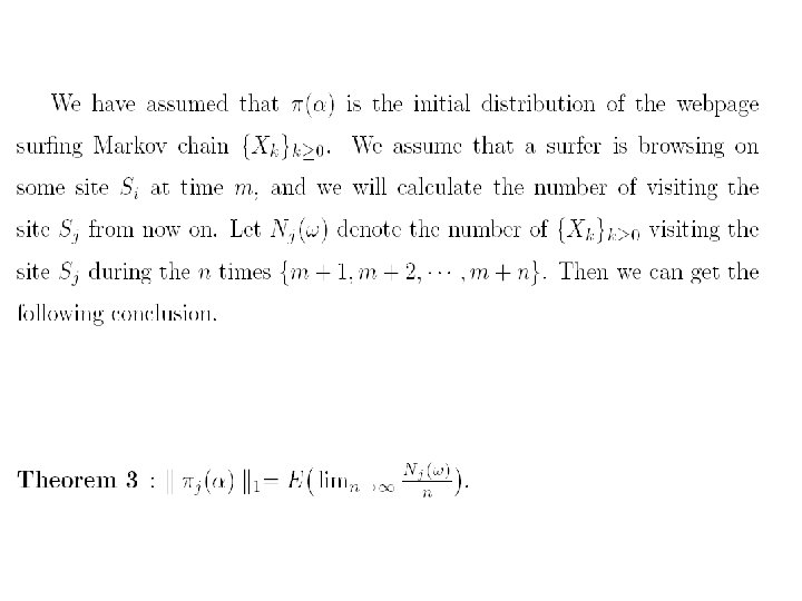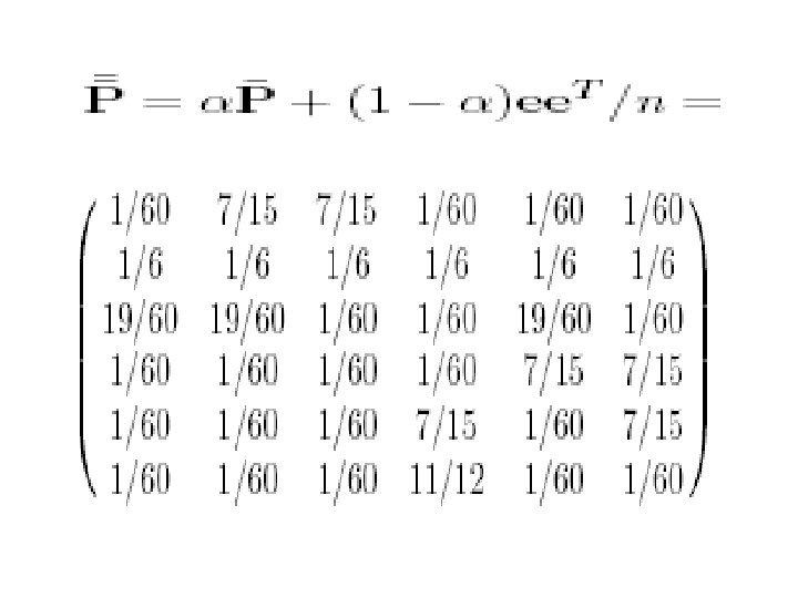 • 对于,也可以有一个直观的解释。设是由转移概率矩 阵确定的马氏链,视为在Inter网上的点击浏览过程, 若的当前状态为,那么或者以概率从指向的网页结点 中等可能地选择一点,或者以概率从全部结点中等可 能地选取一点。根据马氏过程的遍历原理,由迭代法 求出的的非负左特征向量,正好是此点击浏览过程对 网页的平均点击比率。在公式(6)中也可以用状态空 间{1, 2, …, n}上的一个严格正概率分布来代替均匀分布。 行业里称为个性化分布,它的直观解释是网页浏览者 以概率从全部结点中个性化地依分布随机地选取一点。 个性化对网页的排序会有一定的影响。