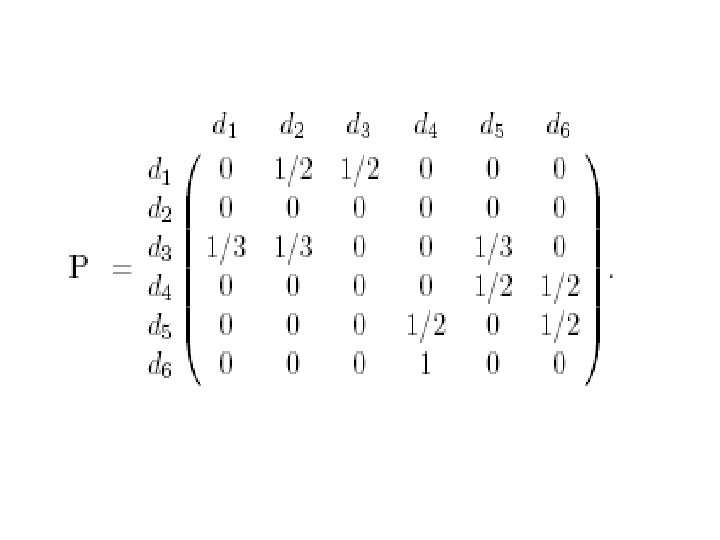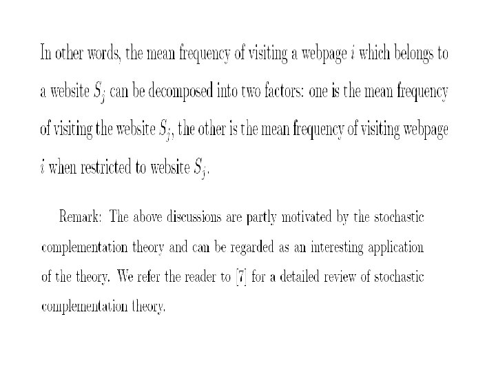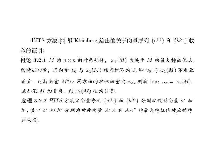 • 对矩阵我们可以有一个直观的解释,设P是具有转移概 率矩阵的马氏链,则该马氏链可以看成是对Inter网页 面的点击浏览过程。若当结点有出度时,即结点有指 向其它页面的超连接时,等可能地从指向的网页结点 里选择一个进行下一步浏览。当结点的出度为 0,则从 全部网络里随机地选择一个网页进行下一步浏览。此 时,如果矩阵具有唯一非负左特征向量,则此特征向 量,除一常数差别外,是马氏链的唯一不变概率测度。 记此不变概率测度为,则由马氏过程的遍历原理,正 好是网页的平均点击比率。这一直观解释进一步说明 了用矩阵的非负左特征向量来为网页排序的合理性。