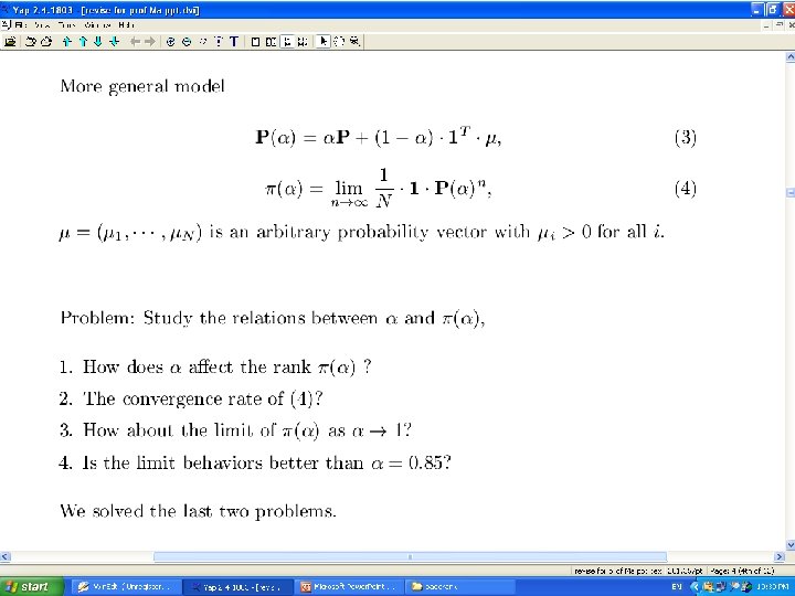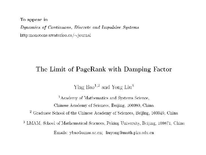 WWW 2005 paper Page. Rank as a Function of the Damping Factor Paolo Boldi Massimo Santini Sebastiano Vigna DSI, Università degli Studi di Milano 3 General Behaviour 3. 1 Choosing the damping factor 3. 2 Getting close to 1 v can we somehow characterise the properties of ? v what makes different from the other (infinitely many, if P is reducible) limit distributions of P?