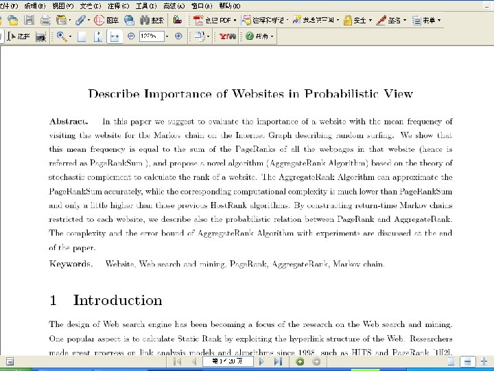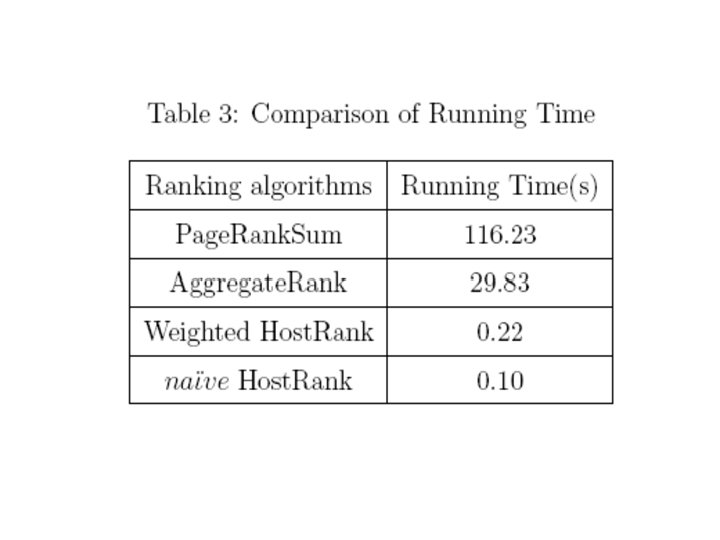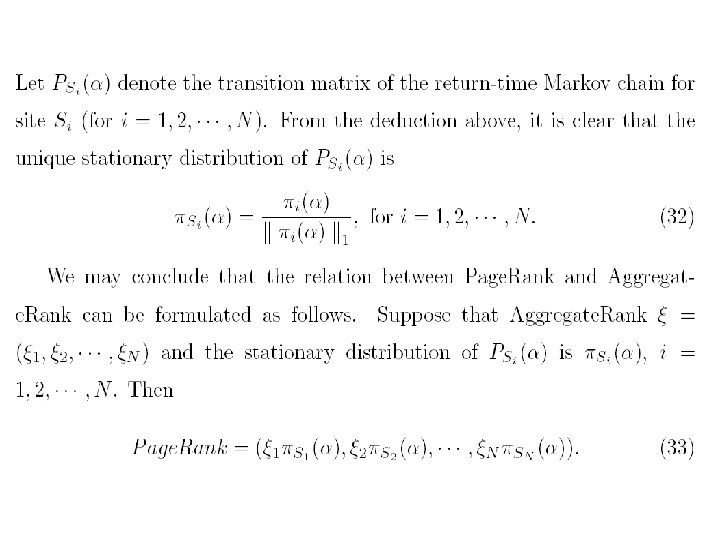 The Aggregate. Rank Algorithm can approximate the. Page. Rank. Sum accurately, while the corresponding computational complexity is much lower than Page. Rank. Sum By constructing return-time Markov chains restricted to each website, we describe also the probabilistic relation between Page. Rank and Aggregate. Rank. The complexity and the error bound of Aggregate. Rank Algorithm with experiments of real dada are discussed at the end of the paper.