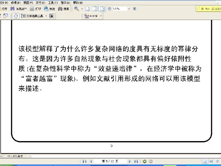 • 目前一些研究者提出了网络的一些演化 模型,解释网络如何演化到我们所观察 到的结构。在这方面的研究还大有可为。 一方面对于已建立的模型缺乏严密的数 学论证,因而不能实质性地理解演化机 制,另一方面还需要开发和建立各种更 为准确的网络模型。