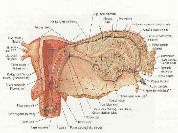 Слои матки - наружный – серозный (периметрий) - средний – мышечный (миометрий) - внутренний – слизистый (субмукозный)