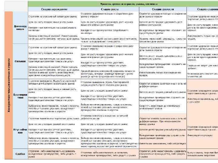 Модель “ADL/LC Конкурентные позиции Характеристика Ведущая Лидер отрасли. Устанавливает отраслевой стандарт и контролирует поведение других конкурентов. Бизнес имеет большой выбор стратегических вариантов. Позиция является результатом абсолютной монополии или надежно защищенного технологического лидерства Сильная Абсолютного преимущества нет, но бизнес может выбирать свою стратегию независимо от действий конкурентов Заметная (благоприятная) Равный среди лидеров в слабо концентрированных отраслях, где все участники находятся на одном уровне. Бизнес характеризуется относительной безопасностью, есть возможность улучшить свое положение Прочная Специализация в узкой или относительно защищенной рыночной нише. Есть возможность долго сохранять такое положение, но нет шансов его улучшить Слабая Слабость связана либо с самим бизнесом, либо с ошибками в менеджменте. Такой бизнес не может выжить самостоятельно