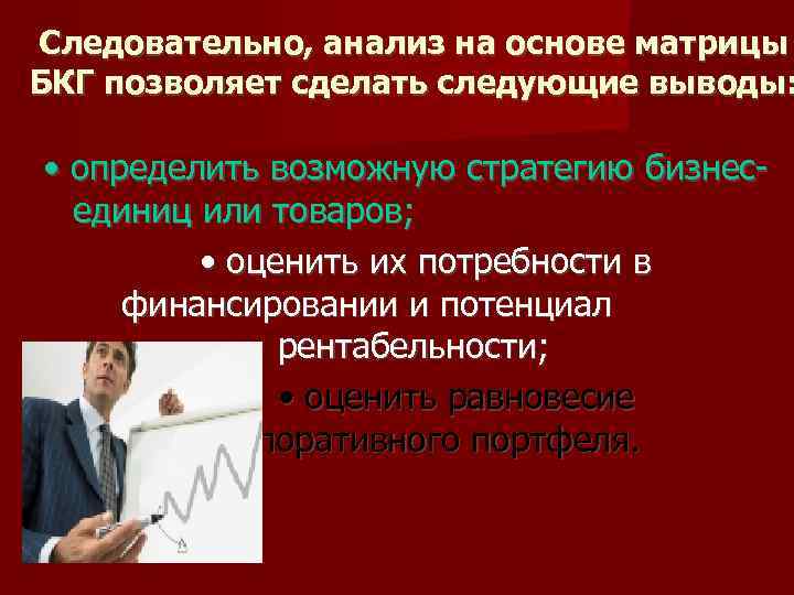 Следовательно, анализ на основе матрицы БКГ позволяет сделать следующие выводы: • определить возможную стратегию бизнес- единиц или товаров; • оценить их потребности в финансировании и потенциал рентабельности; • оценить равновесие корпоративного портфеля.