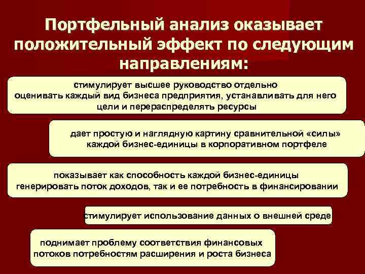 Портфельный анализ оказывает положительный эффект по следующим направлениям: стимулирует высшее руководство отдельно оценивать каждый вид бизнеса предприятия, устанавливать для него цели и перераспределять ресурсы дает простую и наглядную картину сравнительной «силы» каждой бизнес-единицы в корпоративном портфеле показывает как способность каждой бизнес-единицы генерировать поток доходов, так и ее потребность в финансировании стимулирует использование данных о внешней среде поднимает проблему соответствия финансовых потоков потребностям расширения и роста бизнеса