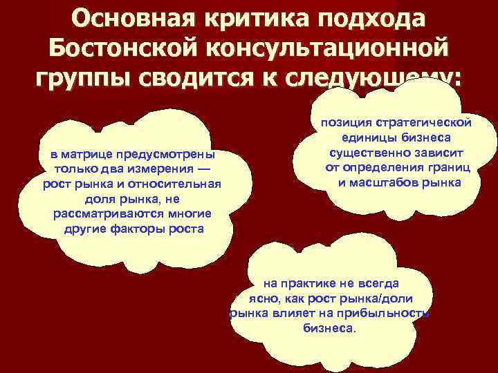 Основная критика подхода Бостонской консультационной группы сводится к следующему: позиция стратегической единицы бизнеса в матрице предусмотрены существенно зависит только два измерения — от определения границ рост рынка и относительная и масштабов рынка доля рынка, не рассматриваются многие другие факторы роста на практике не всегда ясно, как рост рынка/доли рынка влияет на прибыльность бизнеса.