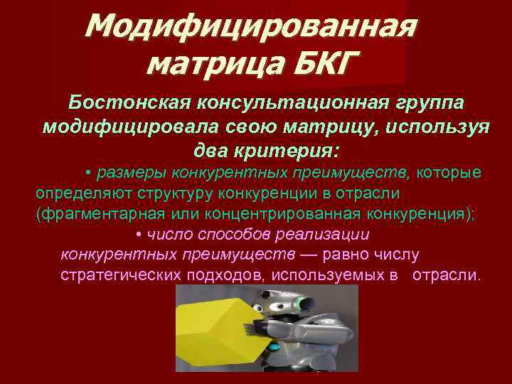 Модифицированная матрица БКГ Бостонская консультационная группа модифицировала свою матрицу, используя два критерия: • размеры конкурентных преимуществ, которые определяют структуру конкуренции в отрасли (фрагментарная или концентрированная конкуренция); • число способов реализации конкурентных преимуществ — равно числу стратегических подходов, используемых в отрасли.