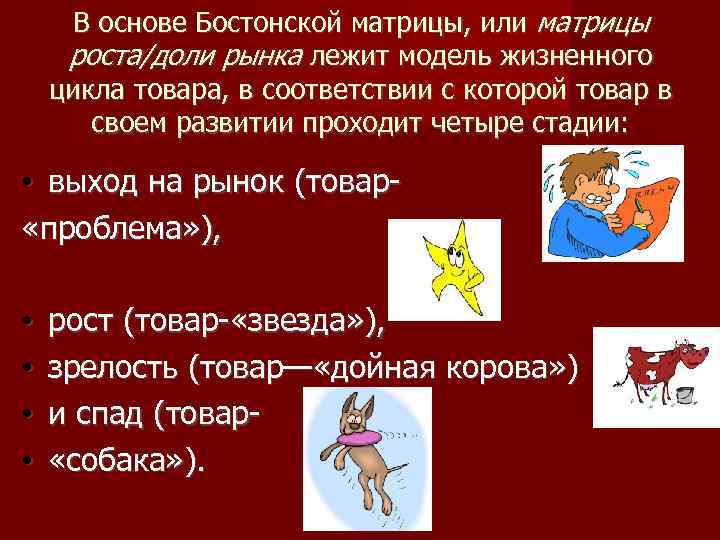 В основе Бостонской матрицы, или матрицы роста/доли рынка лежит модель жизненного цикла товара, в соответствии с которой товар в своем развитии проходит четыре стадии: • выход на рынок (товар- «проблема» ), • рост (товар- «звезда» ), • зрелость (товар— «дойная корова» ) • и спад (товар- • «собака» ).