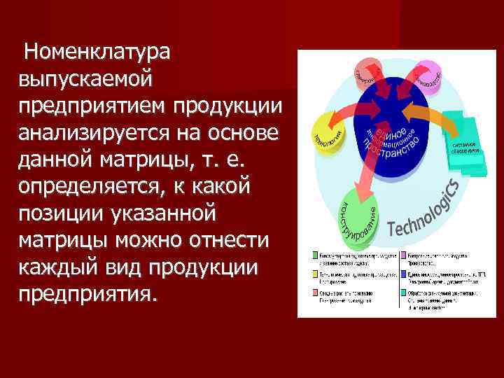 Номенклатура выпускаемой предприятием продукции анализируется на основе данной матрицы, т. е. определяется, к какой позиции указанной матрицы можно отнести каждый вид продукции предприятия.