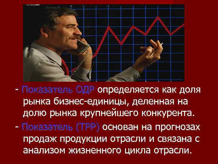 - Показатель ОДР определяется как доля рынка бизнес-единицы, деленная на долю рынка крупнейшего конкурента. - Показатель (ТРР) основан на прогнозах продаж продукции отрасли и связана с анализом жизненного цикла отрасли.