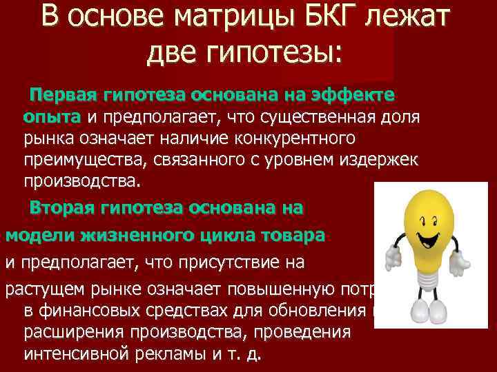 В основе матрицы БКГ лежат две гипотезы: Первая гипотеза основана на эффекте опыта и предполагает, что существенная доля рынка означает наличие конкурентного преимущества, связанного с уровнем издержек производства. Вторая гипотеза основана на модели жизненного цикла товара и предполагает, что присутствие на растущем рынке означает повышенную потребность в финансовых средствах для обновления и расширения производства, проведения интенсивной рекламы и т. д.
