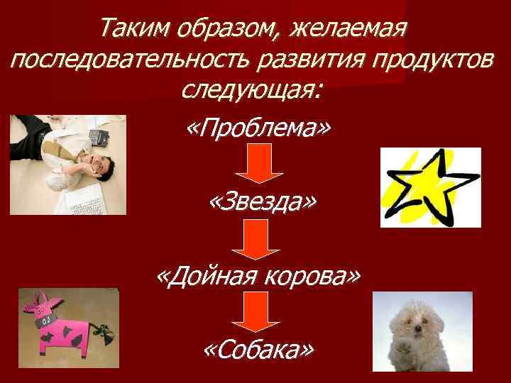 Таким образом, желаемая последовательность развития продуктов следующая: «Проблема» «Звезда» «Дойная корова» «Собака»