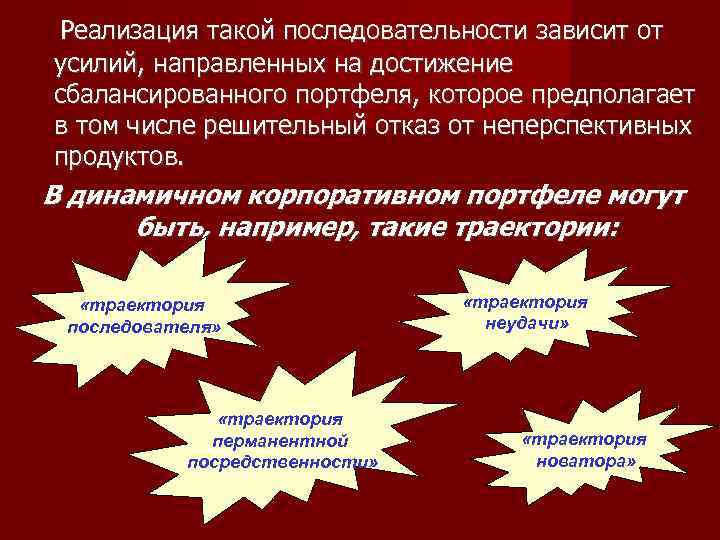 Реализация такой последовательности зависит от усилий, направленных на достижение сбалансированного портфеля, которое предполагает в том числе решительный отказ от неперспективных продуктов. В динамичном корпоративном портфеле могут быть, например, такие траектории: «траектория «траектория последователя» неудачи» «траектория перманентной «траектория посредственности» новатора»