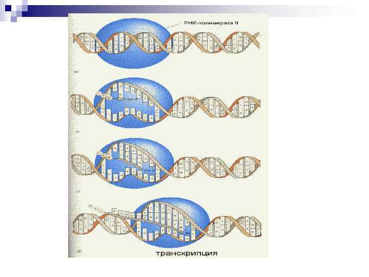 ТРАНСКРИПЦИЯ n Транскрипция- синтез молекул РНК на основании информации, записанной в ДНК n Транскриптон – участок на кодирующей цепи ДНК, ограниченный промотором и сайтом терминации n Осуществляется в ядрах при участии ДНК-зависимых РНК-полимераз I, II и III. n РНК-полимеразы I синтезируют рибосомальные РНК n РНК-полимеразы II синтезируют матричные и вирусные РНК. n РНК-полимеразы III синтезируют транспортные РНК.