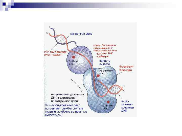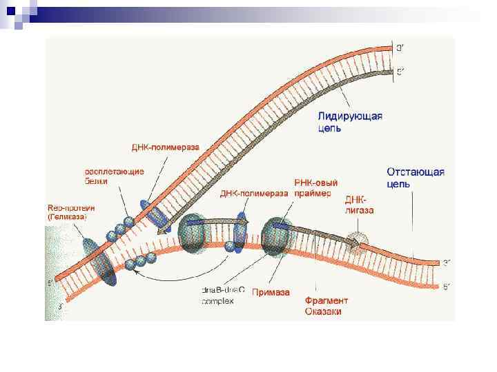 Инициация n n ДНК-топоизомераза I разрывает фосфоэфирную связь в одной из цепей ДНК Образуются репликативные вилки (пузыри) одновременно в нескольких сайтах, которые называются ГЕЛИКАЗЫ расплетают цепи ДНК, они используют энергию АТФ в процессе разрыва водородных связей. биосинтез ПРАЙМЕРА – коротких последовательностей РНК, их называют ЗАТРАВКАМИ осуществляет фермент РНКполимераза или ПРАЙМАЗА