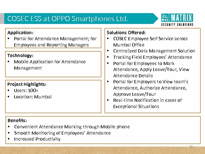 COSECVAM in Corporates? WHY ESS at OPPO Smartphones Ltd. Application: • Portal for Attendance Management; for Employees and Reporting Managers Technology: • Mobile Application for Attendance Management Project Highlights: • Users: 100+ • Location: Mumbai Solutions Offered: • COSEC Employee Self Service across Mumbai Office • Centralized Data Management Solution • Tracking Field Employees’ Attendance • Portal for Employees to Mark Attendance, Apply Leave/Tour, View Attendance Details • Portal for Employers to View team’s Attendance, Authorize Attendance, Approve Leave/Tour • Real-time Notification in cases of Exceptional Situations Benefits: • Convenient Attendance Marking through Mobile phone • Smooth Monitoring of Employees’ Attendance • Increased Productivity 26