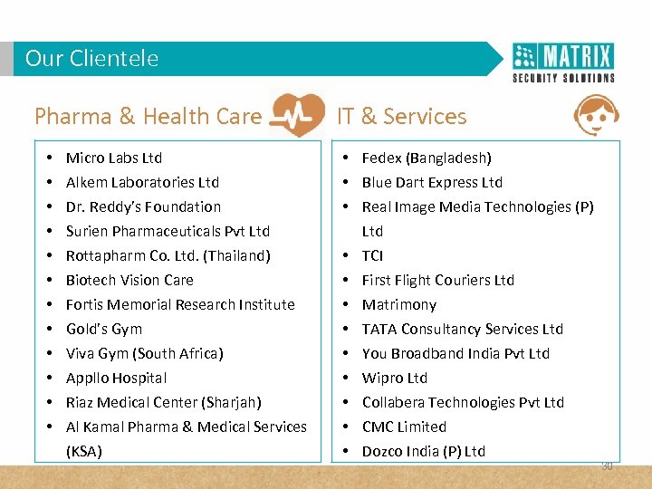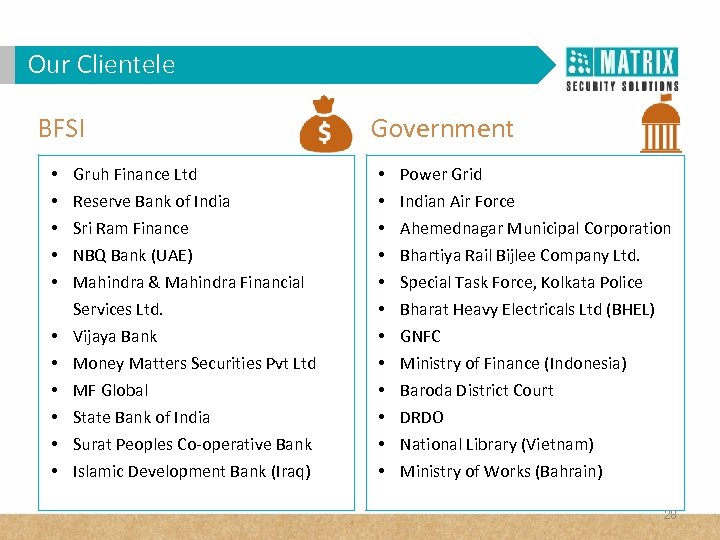Our Clientele BFSI • • • Gruh Finance Ltd Reserve Bank of India Sri Ram Finance NBQ Bank (UAE) Mahindra & Mahindra Financial Services Ltd. Vijaya Bank Money Matters Securities Pvt Ltd MF Global State Bank of India Surat Peoples Co-operative Bank Islamic Development Bank (Iraq) Government • • • Power Grid Indian Air Force Ahemednagar Municipal Corporation Bhartiya Rail Bijlee Company Ltd. Special Task Force, Kolkata Police Bharat Heavy Electricals Ltd (BHEL) GNFC Ministry of Finance (Indonesia) Baroda District Court DRDO National Library (Vietnam) Ministry of Works (Bahrain) 28