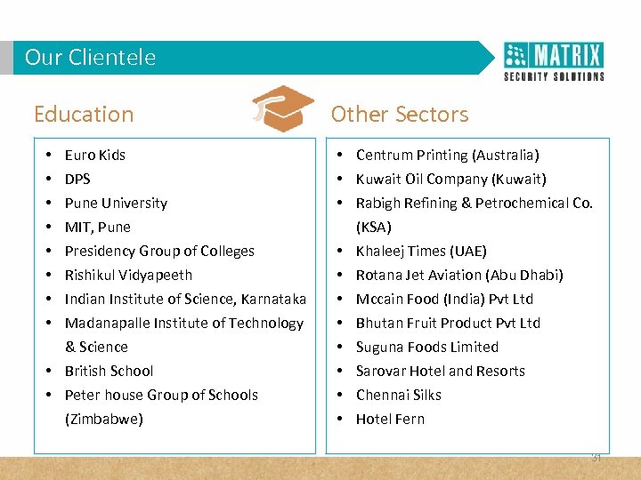 Our Clientele Education Euro Kids DPS Pune University MIT, Pune Presidency Group of Colleges Rishikul Vidyapeeth Indian Institute of Science, Karnataka Madanapalle Institute of Technology & Science • British School • Peter house Group of Schools (Zimbabwe) • • Other Sectors • Centrum Printing (Australia) • Kuwait Oil Company (Kuwait) • Rabigh Refining & Petrochemical Co. (KSA) • Khaleej Times (UAE) • Rotana Jet Aviation (Abu Dhabi) • Mccain Food (India) Pvt Ltd • Bhutan Fruit Product Pvt Ltd • Suguna Foods Limited • Sarovar Hotel and Resorts • Chennai Silks • Hotel Fern 31