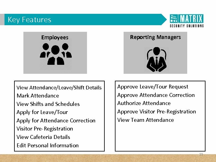 Key Featuresin Corporates? WHY VAM Employees View Attendance/Leave/Shift Details Mark Attendance View Shifts and Schedules Apply for Leave/Tour Apply for Attendance Correction Visitor Pre-Registration View Cafeteria Details Edit Personal Information Reporting Managers Approve Leave/Tour Request Approve Attendance Correction Authorize Attendance Approve Visitor Pre-Registration View Team Attendance 33