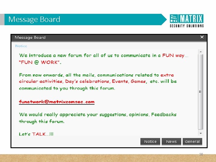 Matrix COSEC Corporates? WHY VAM in. Employee Self Service Virtual Notice Board 19