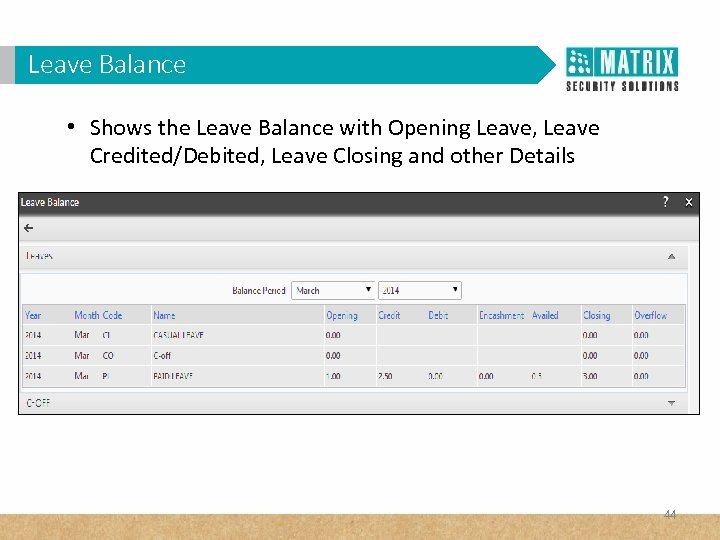 Leave Balance • Shows the Leave Balance with Opening Leave, Leave Credited/Debited, Leave Closing and other Details 44