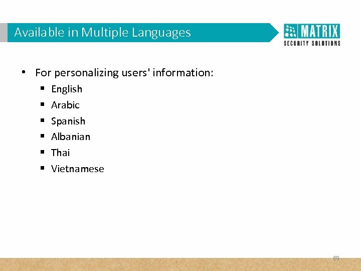 Available in Multiple Languages • For personalizing users' information: § § § English Arabic Spanish Albanian Thai Vietnamese 69