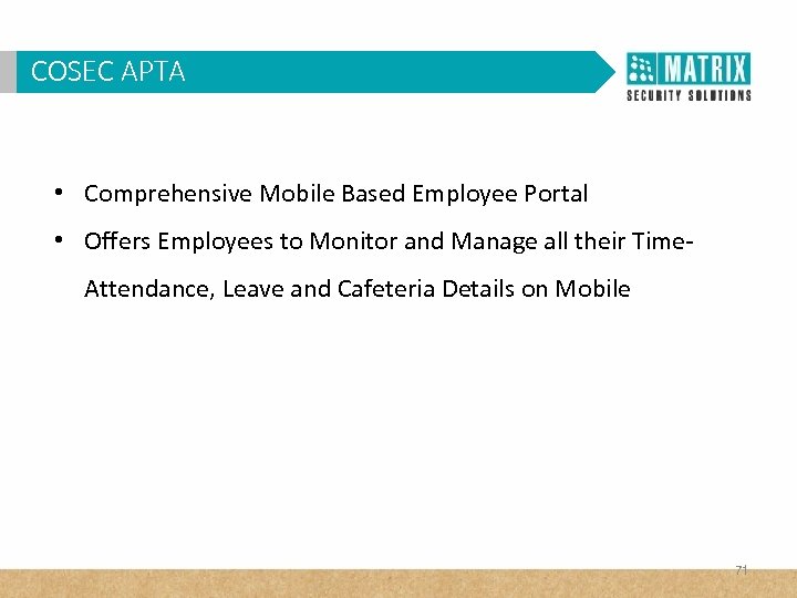 COSEC APTA • Comprehensive Mobile Based Employee Portal • Offers Employees to Monitor and Manage all their Time. Attendance, Leave and Cafeteria Details on Mobile 71