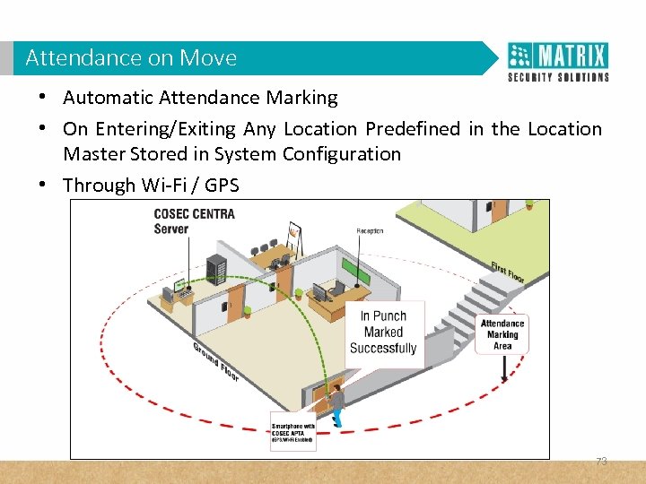 Attendance on Move • Automatic Attendance Marking • On Entering/Exiting Any Location Predefined in the Location Master Stored in System Configuration • Through Wi-Fi / GPS 73