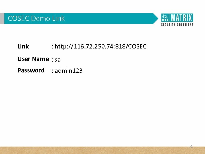 COSEC Demo Link Vehicle Profile Link : http: //116. 72. 250. 74: 818/COSEC User Name : sa Password : admin 123 76