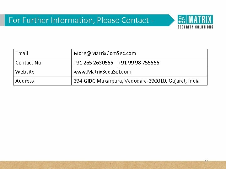 For Further Information, Please Contact Vehicle Profile Email More@Matrix. Com. Sec. com Contact No +91 265 2630555 | +91 99 98 755555 Website www. Matrix. Secu. Sol. com Address 394 -GIDC Makarpura, Vadodara-390010, Gujarat, India 77