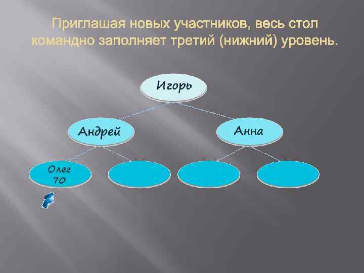 Когда третий уровень заполнен, партнер первого уровня покидает матрицу, получая вознаграждение. Оно равняется сумме входа партнеров 3 -го уровня, т. е. в данном случае 280$. Вознаграждение превышает сумму входа в 4 раза! После выхода партнера первого уровня стол делиться пополам и образуются две новые шапки с заполненными первым и вторым уровнями. Теперь партнеры второго уровня стали на первый и готовятся к выходу на вознаграждение.