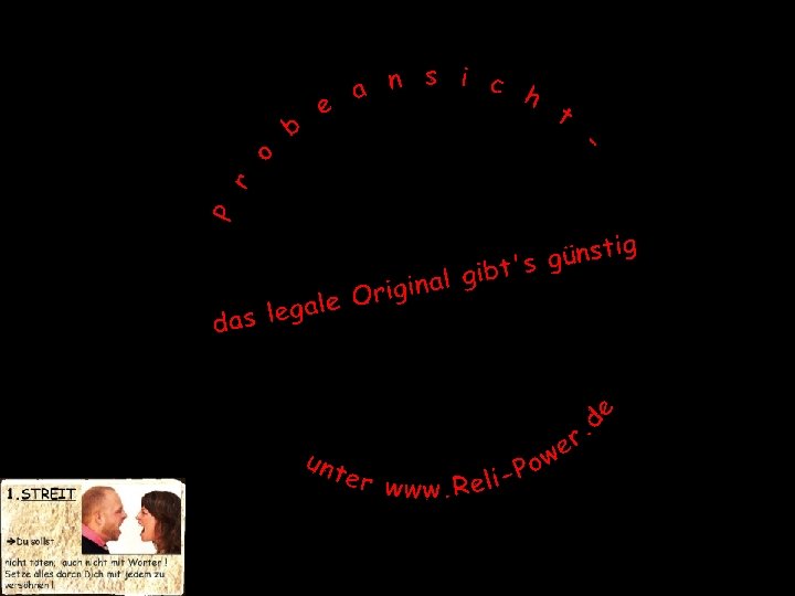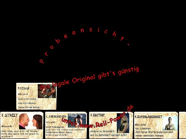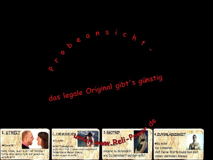 Infos zu dieser Power. Point-Präsentation von www. reli-power. de : Thema (Stichwort) Name dieser PPT BERGPREDIGT 2. : Power. Point: BERGPREDIGT-12 Fundamensteine für Dein Leben Der Betrachter dieser Power. Point lernt anhand von 12 Abschnitten aus der BERGPREDIGT (Matthäus 5 -7), den Standpunkt und die Forderungen von Jesus zu 12 Lebensbereichen kennen. Hier die Stichworte: 1. Streit, 2. Fremdgehen, 3. Egotrip, 4. Zuverlässigkeit, 5 Feinde, 6. Beten, 7. Spenden, 8. Vergeben, 9. Sorgen, 10. Reichtum, 11. Gott bitten, 12. Fehler. Zu diesen 12 Themen der Bergpredigt gibt es 12 Merkbilder und 12 Merksätze in Form von zusammenfassenden „Du sollst“Geboten. So prägen sich wesentliche Aussagen der Bergpredigt zu aktuellen Lebensbereichen gut ein. Das Gleichnis vom Haus auf dem Felsen (u. a. in Comicform!) macht deutlich, dass es sich lohnt, das eigene Lebens-Haus auf diese 12 Fundamentsteine aufzubauen. Diese PP-Präsentation ist sowohl für den Religionsunterricht, als auch für die Gemeindearbeit gut geeignet. Dasselbe gilt auch für das dazugehörige Arbeitsblatt, dass Sie ebenfalls herunterladen können. ca. 8 -12 Jahrgangsstufe ca. 2 -4 U. -Stunden. Inhalt kann aber auch in einer Predigt reduziert wiedergegeben werden, ohne das Lesen aller Bibelstellen. Unterrichts-Stunden Religionsunterricht UND Gemeindearbeit (sowohl für Gemeindegruppen als auch für Predigten !) Einsatzgebiet Folien: 62 Datei Infos MB: ca. 5, 2 Anwendungs-Vorschlag Folgendes Material zum Thema BERGPREDIGT gibt es bei Reli-Power. de: 1. Arbeitsblatt: BERGPREDIGT-12 Fundamentsteine für Dein Leben 2. Power. Point: Die BERGPREDIGT-12 Fundamensteine für Dein Leben HIER! 3. Reli-QUIZ zum Thema BERGPREDIGT 4. Leistungskontrolle Thema BERGPREDIGT P. S. : Reli-Power. de hat auch Material zu den passenden Themen SELIGPREISUNGEN und GEBOTE in der Bibel. 1. 2. Version vom 25. 10. 2011 Copyright © 2009 -2011 by Frank Stepper und dessen Lizenzgebern. Alle Rechte vorbehalten. Autor & Copyright BESCHREIBUNG Kontakt Reli-Power. de, Inh. Frank Stepper, info@Reli-Power. de , Wallstr. , 6, 08538 Reuth, Tel. : 037435 -5343 Download von diesem & weiterem Material unter: www. reli-power. de Nutzungs-Recht Wenn Sie diese Datei per Download unter www. reli-power. de oder mit dem Kauf einer Reli-Power-CD erworben haben, besitzen Sie die personengebundene Genehmigung, das Material in Ihrem Religionsunterricht oder unter im Rahmen einer christlichen Gemeindearbeit zu gemeindepädagogischen Zwecken unter Ihrer Leitung zu nutzen In diesem Rahmen ist Ihnen auch das Ausdrucken und Kopieren von Schüler-Arbeitsblättern und die Abgabe dieser an Ihre Schüler ausschließlich zu diesen unterrichtlichen Zwecken erlaubt. Darüber hinaus sind ausdrücklich verboten: Alle Formen von Weitergabe dieser Datei oder von Teilen des Inhaltes dieser Datei an andere Personen, Institutionen oder digitale Netzwerke, egal in welcher Form. Auch Veränderungen an dieser Datei sind verboten. Danke an alle Graphik-Spender: The Sermon On the Mount by Carl Heinrich Bloch, Danish painter, d. 1890; Streit: aboutpixel. de / ohne Titel 14 © Konstantin Gastmann; aboutpixel. de / Liebespaar am Attersee © Victoria Sophia Braun; aboutpixel. de / Hochmut © Susanne Kiesenhofer; aboutpixel. de / So proud © Broiler; aboutpixel. de / streit © Sven Brentrup; Betende Hände von Albrecht Dürer; aboutpixel. de / abschied © Sven Brentrup; aboutpixel. de / traurig rumhängen © Holger Hecklau; aboutpixel. de / Zahltag_2 © Rainer Sturm; aboutpixel. de / offene Hand © getready; aboutpixel. de / Zeigefinger © Kristina Kittlaus; aboutpixel. de / Trinkgeld © georgmaster; Alle Comics & Steine-Graphiken von Simeon Wetzel www. Jesus- Quellen- & Bildnachweis