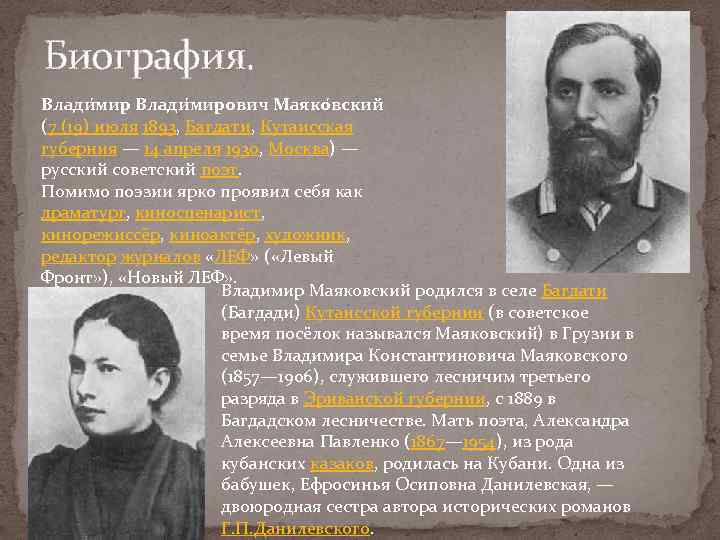 Биография. Влади мирович Маяко вский (7 (19) июля 1893, Багдати, Кутаисская губерния — 14 апреля 1930, Москва) — русский советский поэт. Помимо поэзии ярко проявил себя как драматург, киносценарист, кинорежиссёр, киноактёр, художник, редактор журналов «ЛЕФ» ( «Левый Фронт» ), «Новый ЛЕФ» . Владимир Маяковский родился в селе Багдати (Багдади) Кутаисской губернии (в советское время посёлок назывался Маяковский) в Грузии в семье Владимира Константиновича Маяковского (1857— 1906), служившего лесничим третьего разряда в Эриванской губернии, с 1889 в Багдадском лесничестве. Мать поэта, Александра Алексеевна Павленко (1867— 1954), из рода кубанских казаков, родилась на Кубани. Одна из бабушек, Ефросинья Осиповна Данилевская, — двоюродная сестра автора исторических романов Г. П. Данилевского.