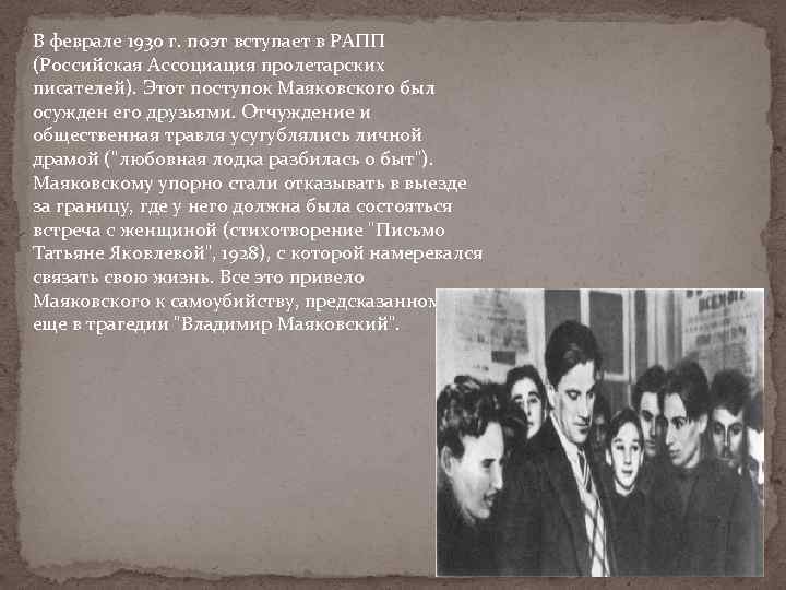 В феврале 1930 г. поэт вступает в РАПП (Российская Ассоциация пролетарских писателей). Этот поступок Маяковского был осужден его друзьями. Отчуждение и общественная травля усугублялись личной драмой ("любовная лодка разбилась о быт"). Маяковскому упорно стали отказывать в выезде за границу, где у него должна была состояться встреча с женщиной (стихотворение "Письмо Татьяне Яковлевой", 1928), с которой намеревался связать свою жизнь. Все это привело Маяковского к самоубийству, предсказанному еще в трагедии "Владимир Маяковский".