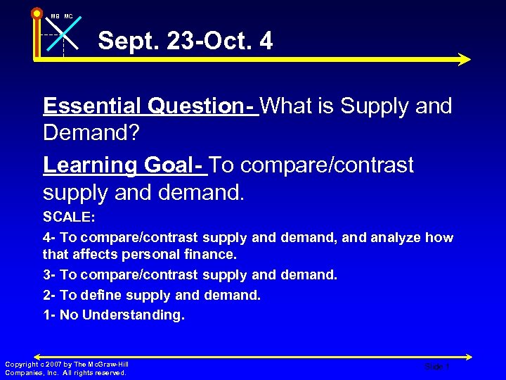 MB MC Sept. 23 -Oct. 4 Essential Question- What is Supply and Demand? Learning Goal- To compare/contrast supply and demand. SCALE: 4 - To compare/contrast supply and demand, and analyze how that affects personal finance. 3 - To compare/contrast supply and demand. 2 - To define supply and demand. 1 - No Understanding. Copyright c 2007 by The Mc. Graw-Hill Companies, Inc. All rights reserved. Slide 1