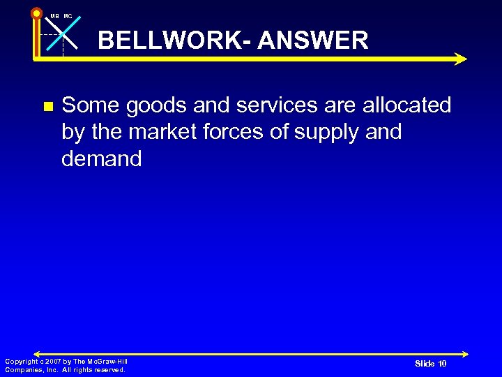 MB MC BELLWORK- ANSWER n Some goods and services are allocated by the market forces of supply and demand Copyright c 2007 by The Mc. Graw-Hill Companies, Inc. All rights reserved. Slide 10